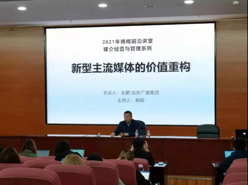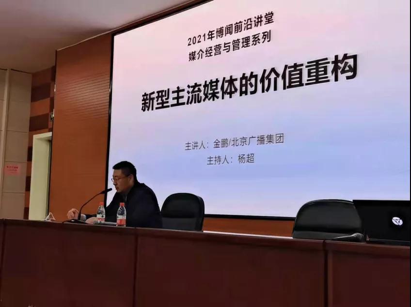 新媒体中心副主任杨超老师主持,2020级硕士研究生100余人在文化楼西区一层报告厅现场聆听了讲座。讲座中,金鹏老师基于自身的丰富从业经历及在BTV新媒体“北京时间”五年的探索与实践经验解读了新型主流媒体的价值重构,讲座围绕五个观点依次展开。