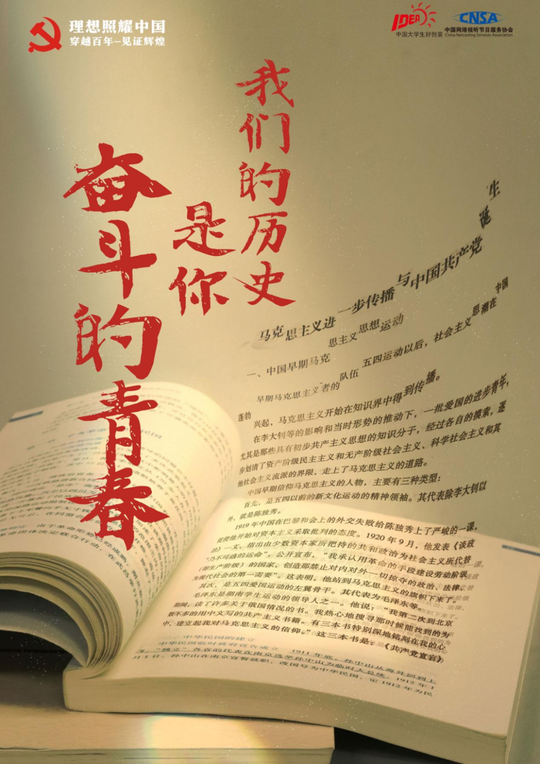 文案部分用红色的毛笔字,对应红色文化、表现百年来热血的青年时刻为祖国奉献的意思。我们现在书中的历史,正是共产党员们奋斗的青春故事。