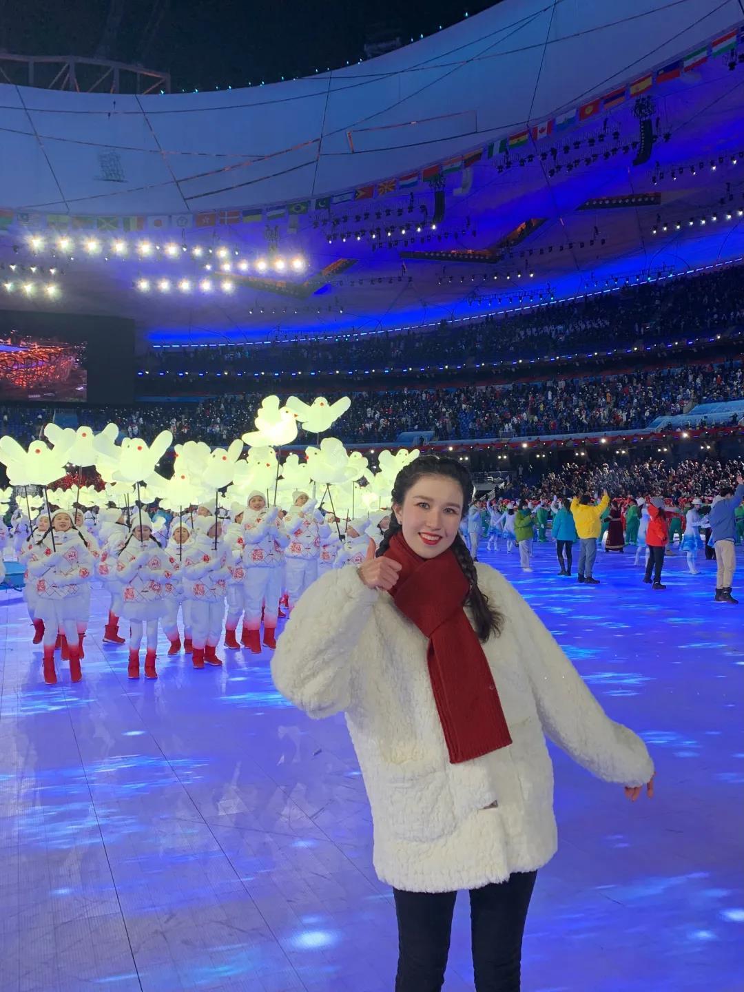 “生逢其时,何其幸运!从9月面试到入选演员至今历时4个月,最后以青年大学生的身份加入《致敬人民》节目,我非常荣幸地见证了2022北京冬奥开幕式的圆满结束,并在这个国际大舞台上圆满完成了任务。这紧张而又兴奋的4个月仿佛一场电影,一帧帧难忘的画面在我脑海中浮现。我记得每一次在寒风中导演们辛苦忙碌的身影,记得耳麦中的口号节拍,记得大雪中鸟巢的美丽浪漫,记得第一次联排看见烟花激动不已,记得大家双颊冻得通红瑟瑟发抖也在坚持的精神,记得武校的弟弟们听着无数次的‘再来一遍’也毫无怨言的毅力。”