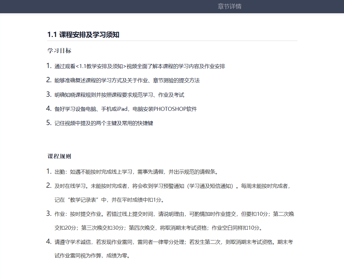 主讲“电脑设计基础”课程的郭梅雨老师在第一堂网课中就与同学们“约法三章”,详细列出了课程安排和学习须知,这不仅能够帮助同学们更清楚地了解课程规划,也有利于督促同学们养成良好的听课和学习习惯,从而更好地做好线上学习规划并有序地进行学习。