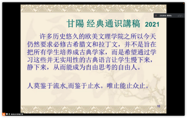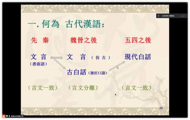 蒋建设老师正在向大家介绍“什么是古代汉语”