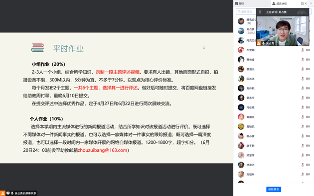 作为一门学科基础课程,“新闻学理论”在新传学子心中有着重要的位置。吴占勇老师以他特有的幽默风趣的课堂风格,给同学们带来了轻松愉快的课堂体验,让同学们即使在线上也拥有如同和老师面对面的实时互动。