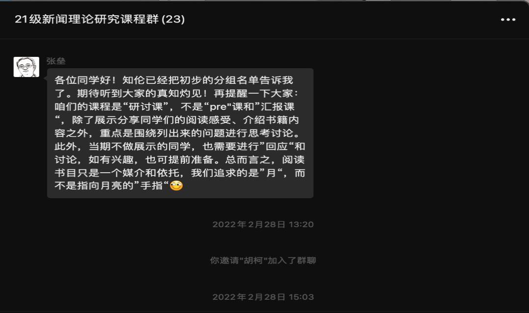 课前,他在微信群中向同学们提出了几个问题:“如何理解‘新闻’与‘新闻理论’”、“通过这门课程希望实现的学习目标”、“有没有可以向大家推荐的新闻研究经典书籍”。虽然同学们远在云端,但课堂上研讨的氛围依然浓烈,有的同学用本科学习的知识畅谈想法,也有同学从新闻职业人的角度提出个人见解,还有同学在课堂上讲述了本科时期第一次听张垒老师的讲座时的所感所悟,分享了自己的收获。张垒老师积极与同学们互动交流,不仅为同学们解答困惑,还不断启发同学们继续思考,同学们也不断迸发出新观点。