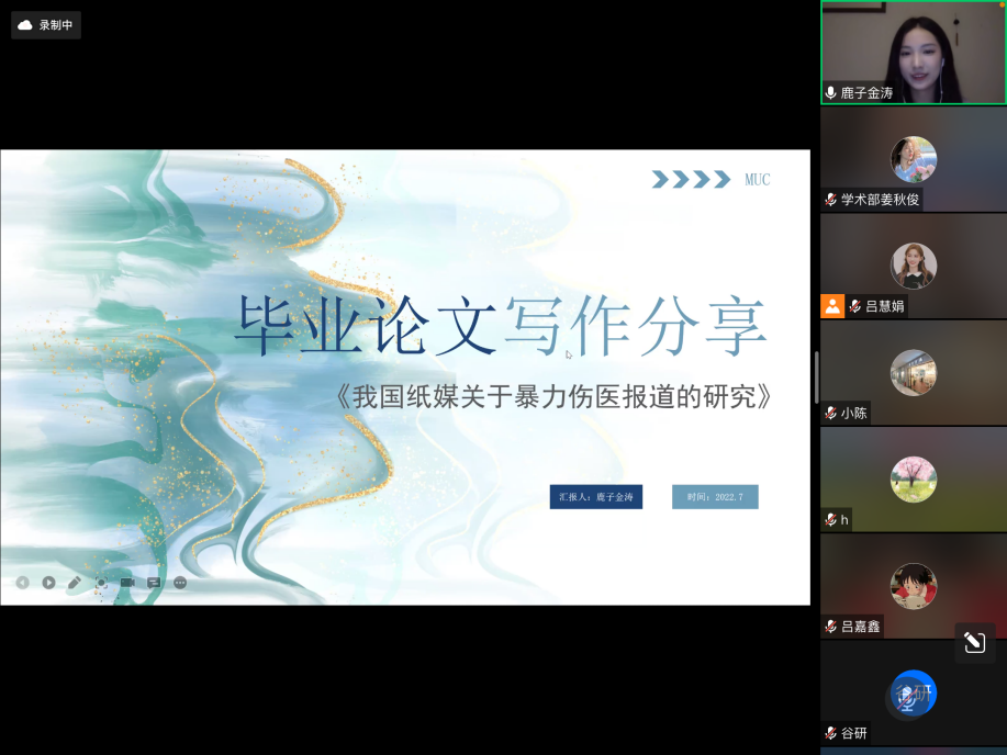 本场学术沙龙邀请了2019级新闻学硕士研究生张宝誉、2019级传播学硕士研究生鹿子金涛和2020级新闻与传播硕士研究生李贝贝作为主讲嘉宾,分别从选题构思、时间安排、论文答辩等方面进行分享。同时,本场沙龙还邀请到了毛湛文老师和吴占勇老师作为互动嘉宾进行指导。