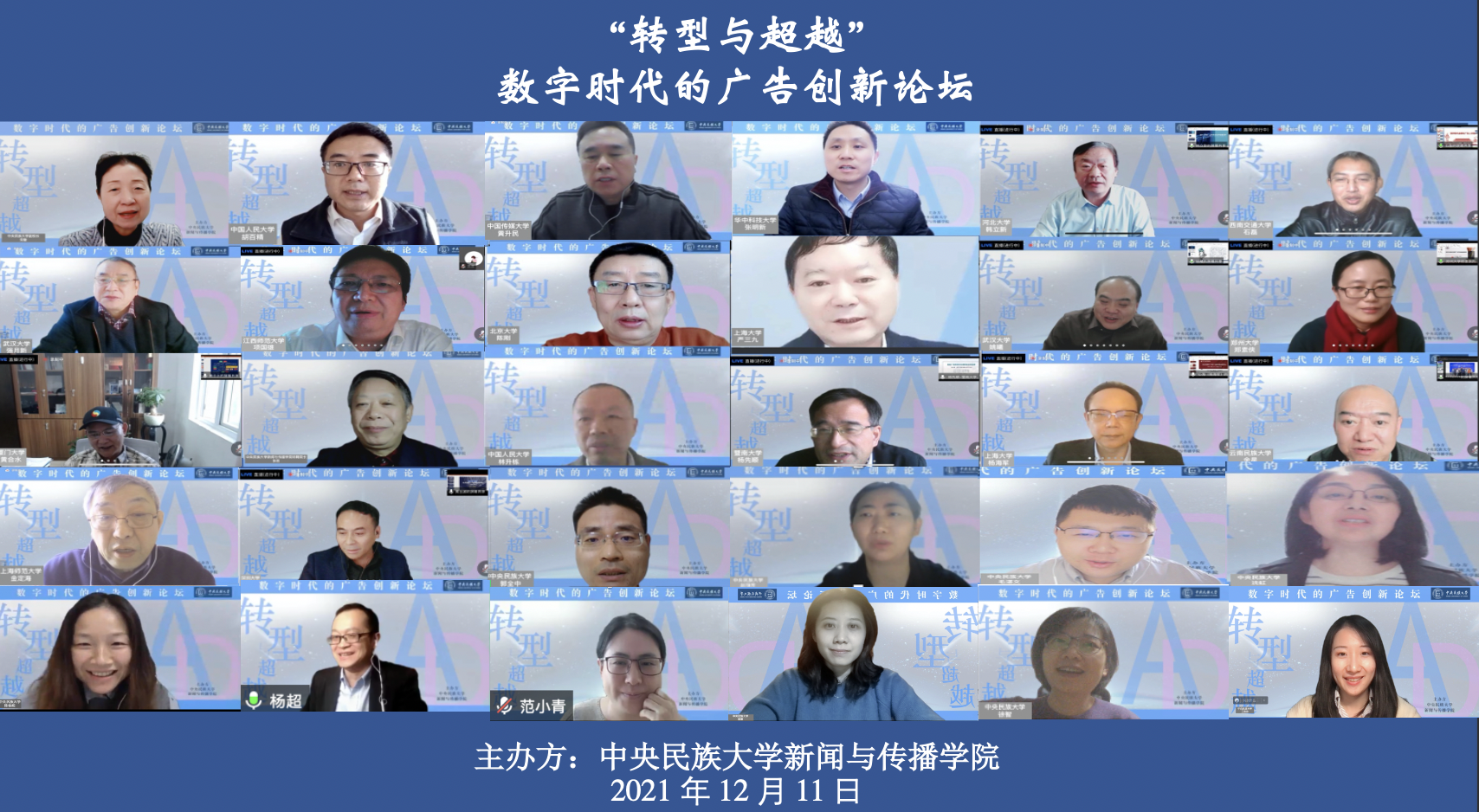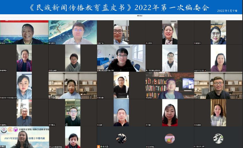 2022年1月9日晚,《民族新闻传播教育蓝皮书》(以下简称《蓝皮书》)2022年第一次编委会在腾讯会议顺利召开。来自近30所民族院校、西部高校的新闻传播院系的编委和作者齐聚云端,共商《蓝皮书》下一步...